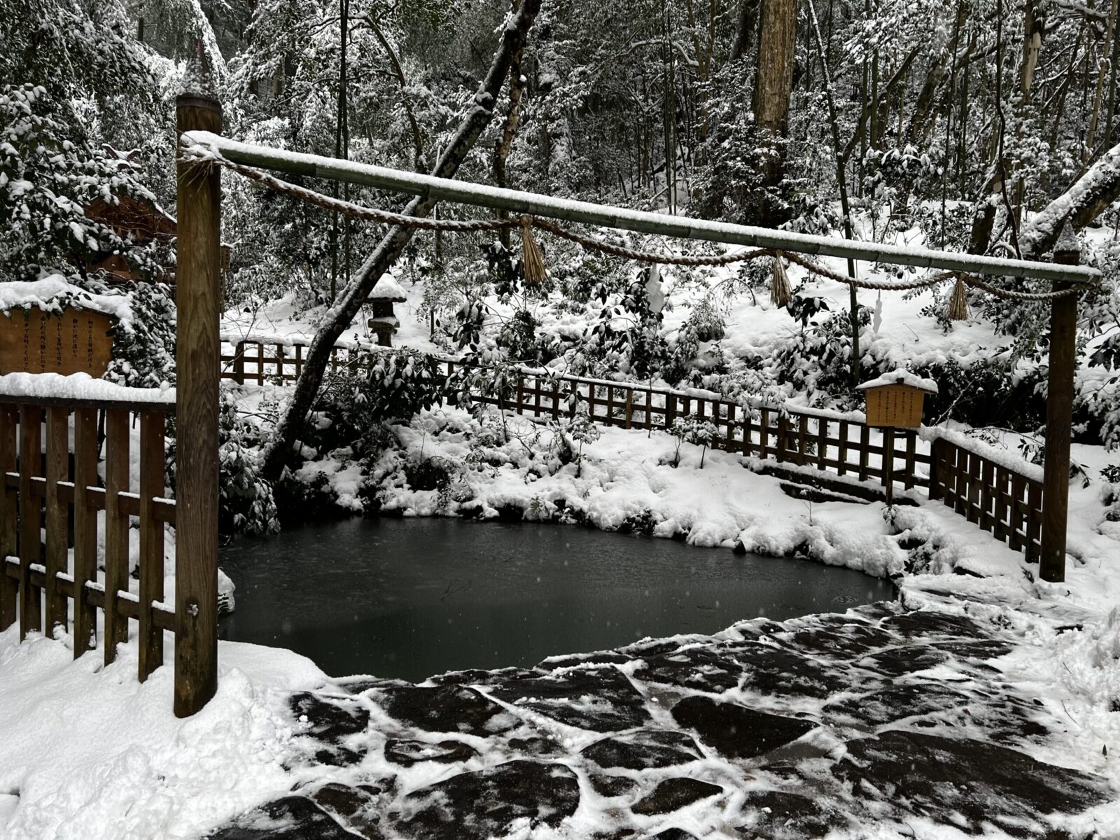 なので、社務所が開いてから、お守りなどは授かりましたが、占いはやりませんでした。凍ってたのは、前日から雪が降り積もり、この日は陽が射していたものの、かなりの冷え込みだったせいです。凍った池にただ占いの紙と賽銭が乗っかってたら、それはそれで面白い絵にはなったでしょうけど、でしょうけど!