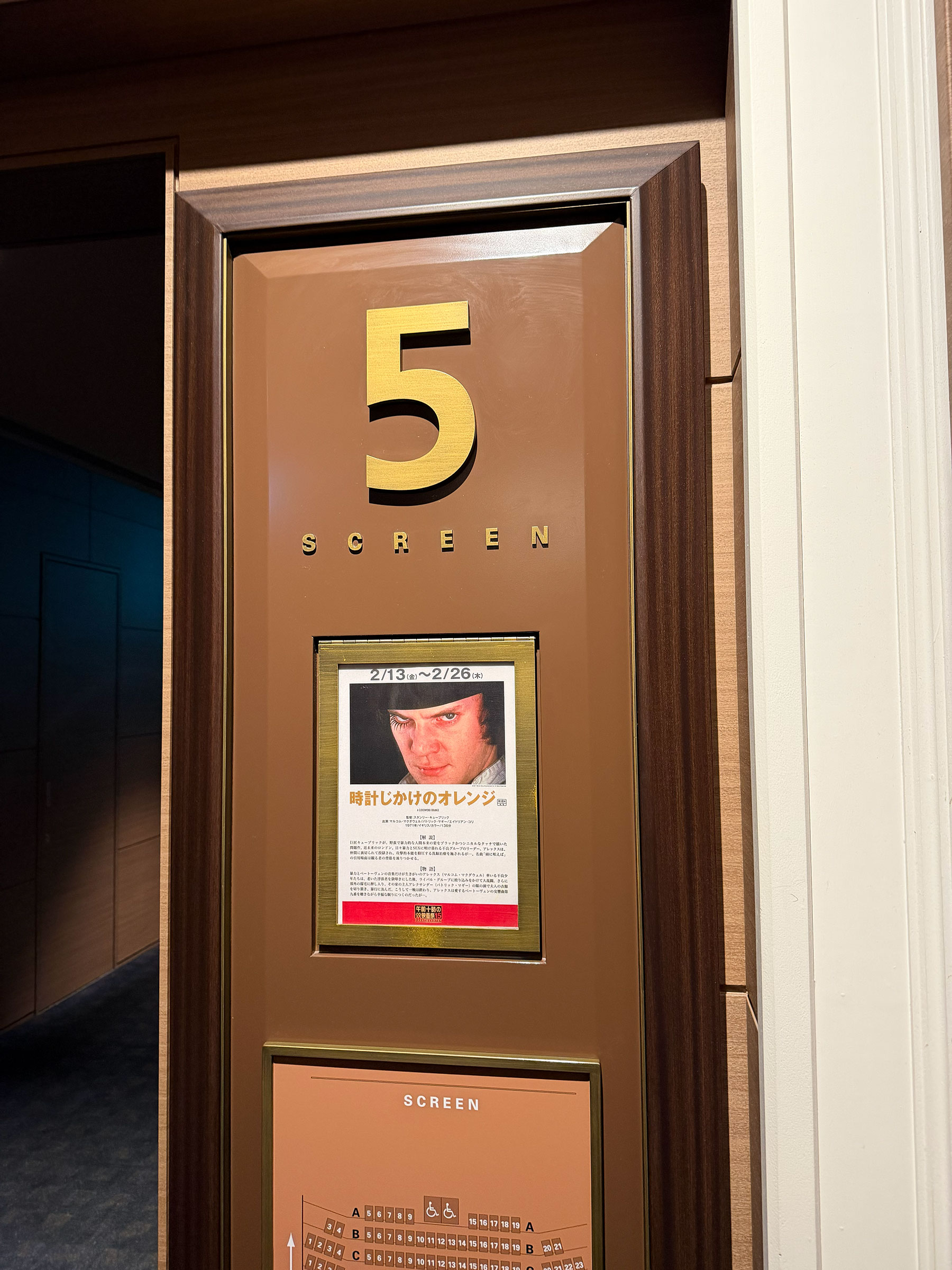 TOHOシネマズ日本橋、スクリーン5入口脇に掲示された『時計じかけのオレンジ』午前十時の映画祭15版の紹介記事。
