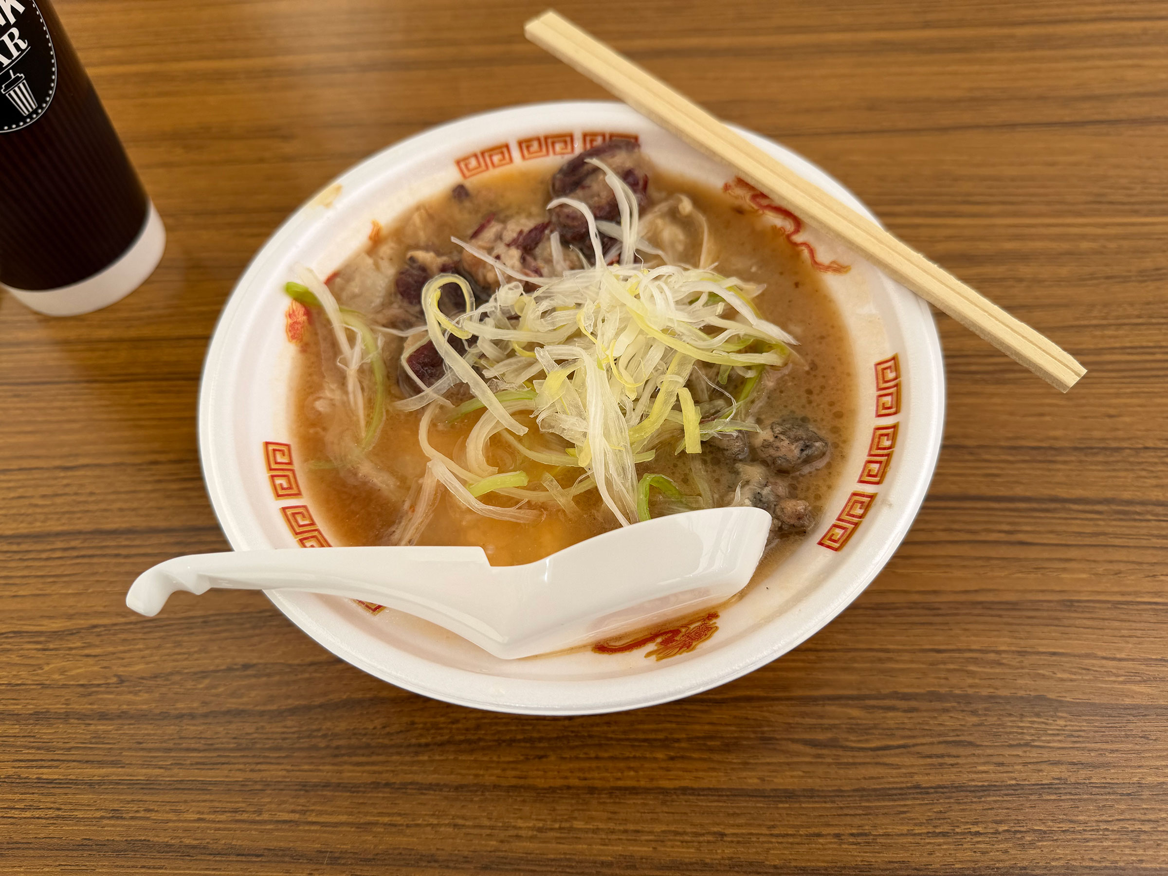 トッピングなしの場合の具材はトロトロに煮込んだチャーシューと、炙られたお肉……こちらはたぶん親鶏ではなかろうか。そこに長細く刻んだタマネギ。店頭の写真ではキクラゲらしきものも乗ってますが、提供された料理では一見したところ解りません。もしかしたら細かく刻んだのかも。あと、恐らくは背脂も投入されている――“恐らく”と付けるのは、これが熊肉の脂身である可能性があるから。